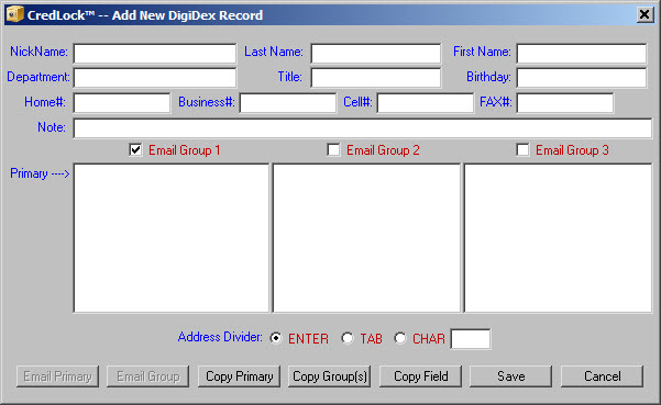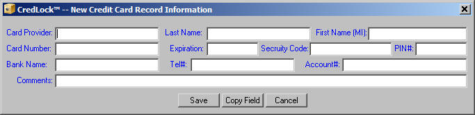 CredLock's database permits you to store records of various content including internet websites complete with logon credentials, credit card information. We also have a record type that we have named "DigiDex"™ much like the old Rolodex™ system. You can also keep track of personal property and collectibles using our property and miscellaneous record types.