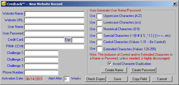 As you can see from the above image, directing you to the right side of the window, are a series of fields whereby you can select the make-up of your user name and/or password (Credentials). Not only can you select what type of characters are contained in your credentials, but the number of each character type simply by entering the desired number of characters in the data field to the left of the character type. Notice the "Avoid Character Duplication" checkbox near the bottom of the record window. By activating this checkbox you are instructing CredLock, when possible given the character types and counts to not duplicate any characters that have been previously placed in the credential.