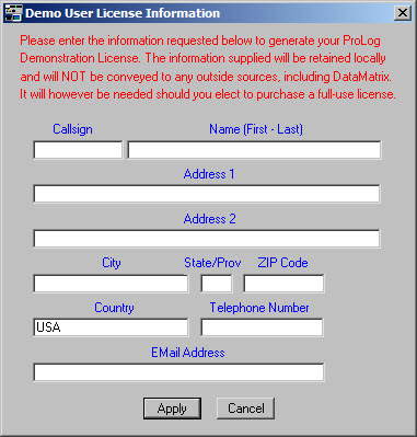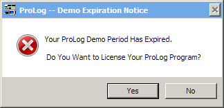 After your demo period has expired, launching ProLog will display the message shown below. Any contacts you have logged-to-date will remain intact, however to continue to use Prolog you must become a registered user of the program. That is, you must elevate your demo license to a standard Full-Use-License. Clicking "Yes" on the expiration message window will display a series of steps with a "Purchase" button that will take you directly to the ProLog secure-order-form. Because the license is delivered digitally, Shipping and Handling fees are not required. If you click the "No" button on the demo period expiration message, ProLog will immediately exit returning you to the desktop.