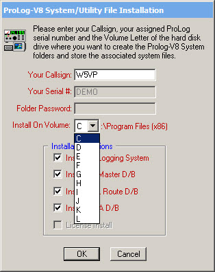 Place your callsign into the first field then pull-down and select the disk volume where you wish to install the Prolog-V8 Demo System. Remember, if the system is being installed on any other drive volume other than your primary hard drive, (normally 'C:') you must create a "Program Files" and "Program Files (x86)" folder on that media. Select the "Install on Volume" drive letter, then click the "OK" button.