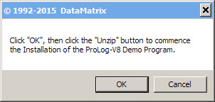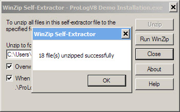 The message window above indicates that the files that comprise the ProLog demo IPACK have been successfully extracted and placed into a folder named "ProLog-V8 Install" which has been created in your "Downloads" folder. The unzipped file count may vary based on the IPACK content.