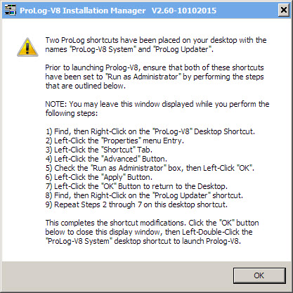 For ProLog-V8 to function properly, it must have full access to system resources. That said, ProLog must be launched with Administrator Privileges. This necessitates that the two desktop shortcut ICON's shown above be set accordingly. For those users not familiar with this procedure, following the installation of the ProLog-V8 demo, the installation program will conveniently display the window shown below which contains step-by-step instructions to establish administrator rights for each of your desktop ProLog shortcuts.