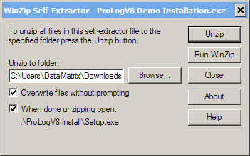 Regardless of the browser used to download the Demonstration Installation Package (IPACK), your local "Downloads" folder will contain a file named "ProLogV8 Demo Installation.exe". This file is formatted as a WinZip™ self-extracting file that contains an integrated installation program. NOTE: If it is your intent to install the ProLog Demo on to an external hard disk or flash drive, you must manually create both a "Program Files" and "Program Files (x86)" folder on the external media prior to commencing the installation process.